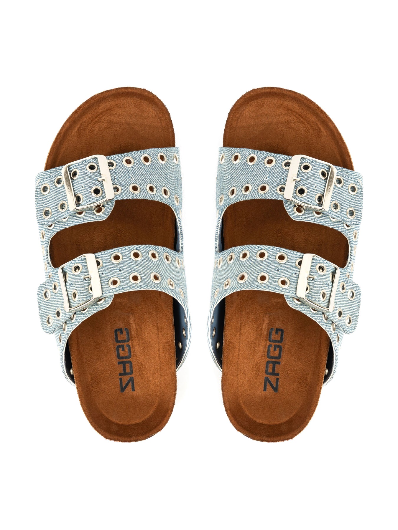 Designed for effortless everyday wear, these women’s double strap slides combine timeless design with all-day comfort. Finished in a denim-blue suede-look upper, they feature adjustable metal buckles that provide a secure, customized fit while adding a casual yet refined touch to the classic silhouette.