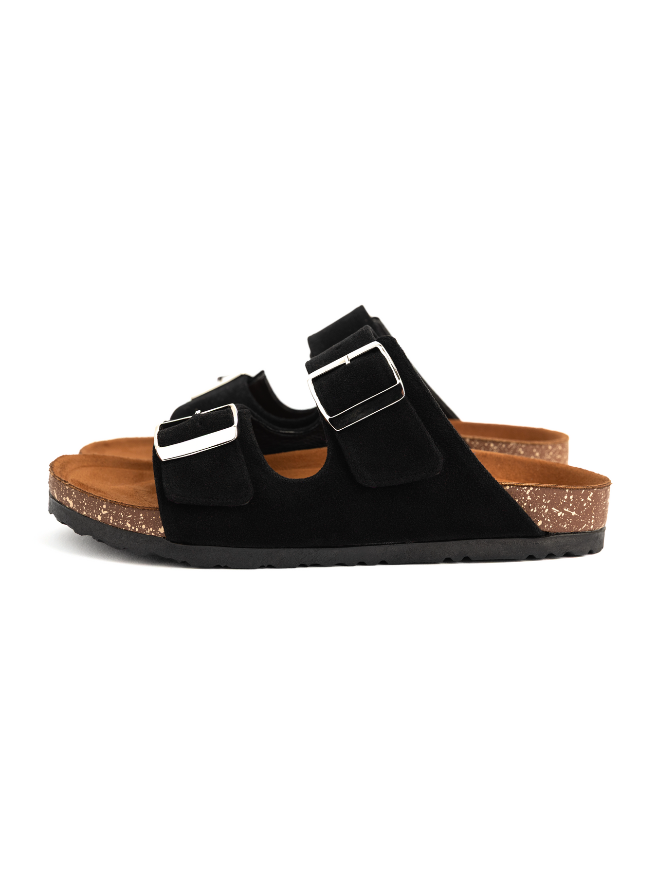 Designed for effortless everyday wear, these women’s double strap slides combine timeless style with all-day comfort. Featuring a sleek suede-finish upper with adjustable metal buckles, they offer a secure, customized fit while maintaining a refined, minimalist look.